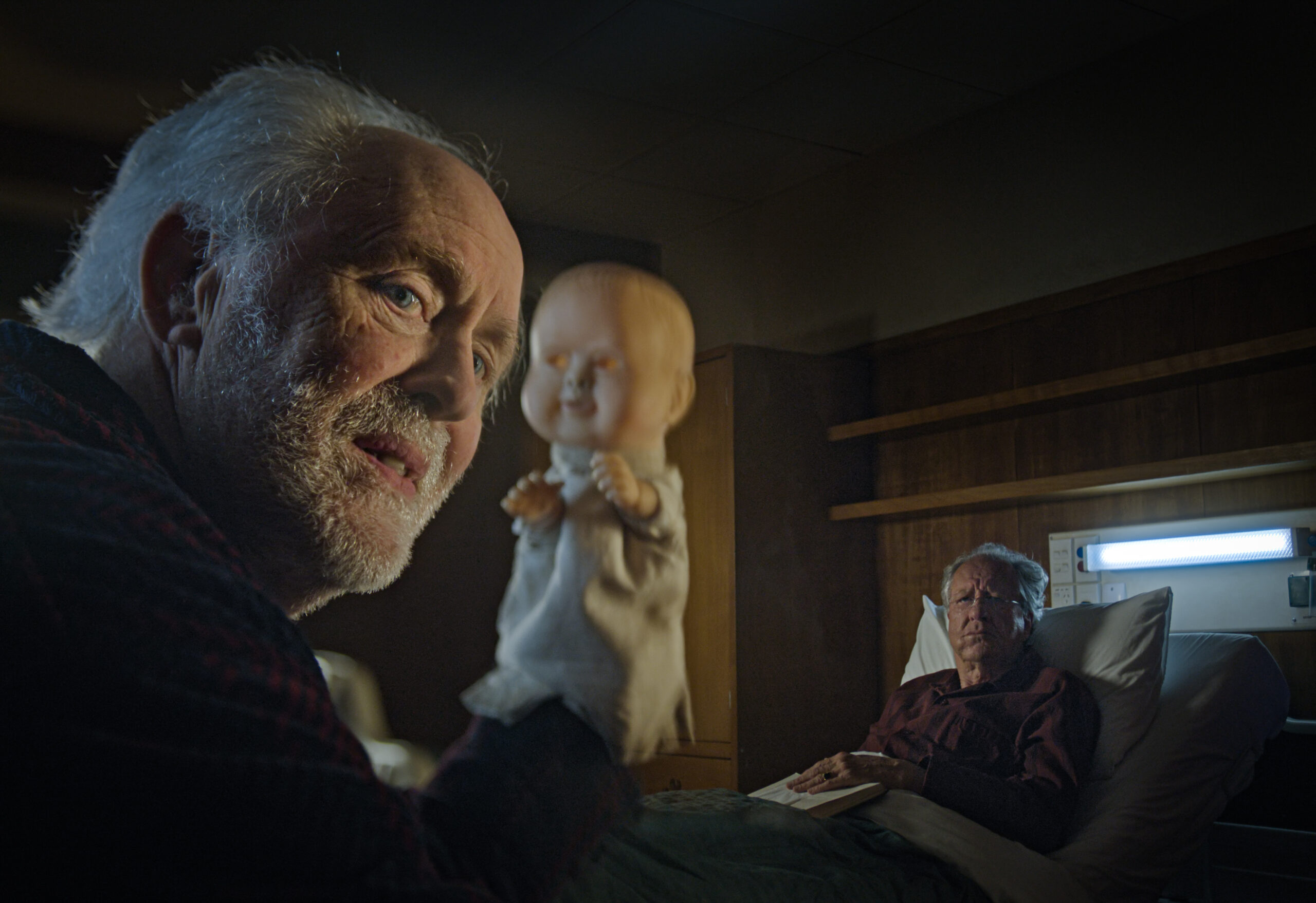 The Rule of Jenny Pen was co-written and directed by James Ashcroft, whose previous works include Home in the Dark (2021) and the upcoming feature The Whisper Man, which will star Robert De Niro. The film is based on the short story The Rule of Jenny Pen by Owen Marshall, published by Vintage NZ LTD. The Rule of Jenny Pen is a thriller that delves into psychological horror. To my surprise, horror manifests in various forms throughout the story. Dave and his eerie Jenny Pen doll puppet often create an unsettling atmosphere, but Stefan’s experience of living in his new home and old age adds a layer of true horror. The physical changes in Stefan heighten the tension and suspense within the home environment, as do diegetic sounds, such as the disconcerting screams of a patient in the background. As an older man facing numerous health challenges, Stefan’s struggle to regain the trust and support of caregivers becomes a form of horror.