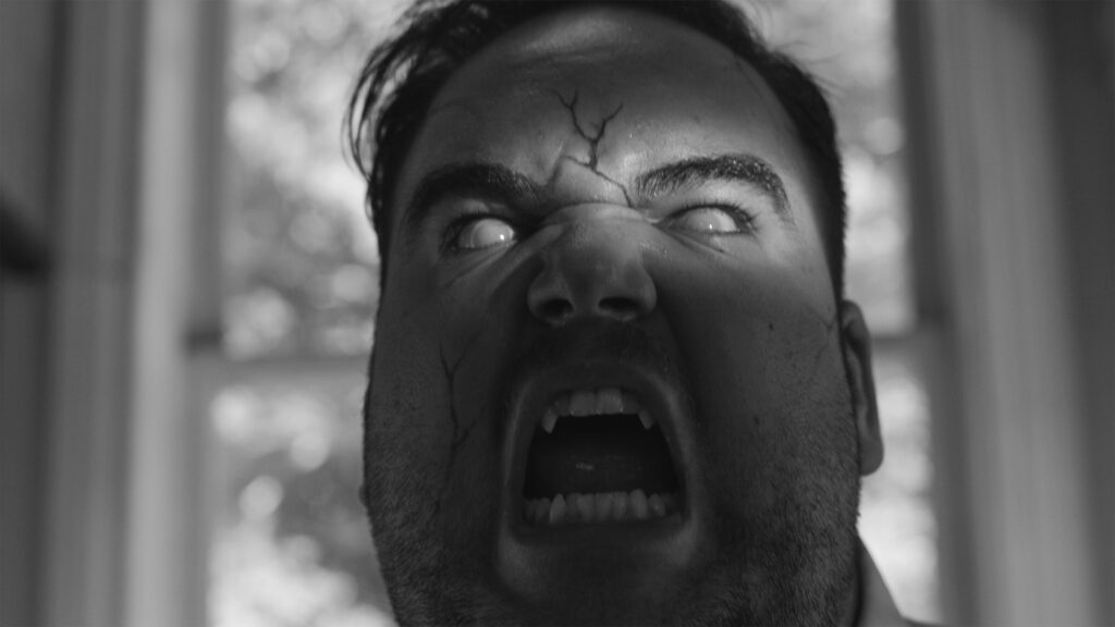 Vampire Zombies… from Space! is a horror and sci-fi spoof inspired by titles such as Spaceballs, Psycho Goreman, Ed Wood, Night of the Living Dead, and more. Directed by Michael Stasko and written by Jakob Skrzypa, Alex Forman, and Michael Stasko, the film is a clear homage to classic 1960s horror and sci-fi cinema from the opening frame. The entire film features classic black-and-white visuals and playful special effects, often used purely for gags. The playful effects include fake bats on strings, ships making buzzing sounds clearly produced by someone using their mouth, old-style costumes, and- most importantly for horror fans- extreme, practical effects violence, complete with ridiculous blood splatter. There are plenty of scenes filled with guts and gizzards, all done deliberately for comedic effect.